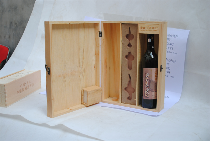 有內襯酒具的紅酒包裝禮品盒,因為定位稍高端一點,原料多是松木或更高端一點的木材,如榆木,橡木,櫸木,紅胡桃,奧古曼等,原木色價格不高,做高檔油漆后價格高很多,但效果也是非常不錯的。