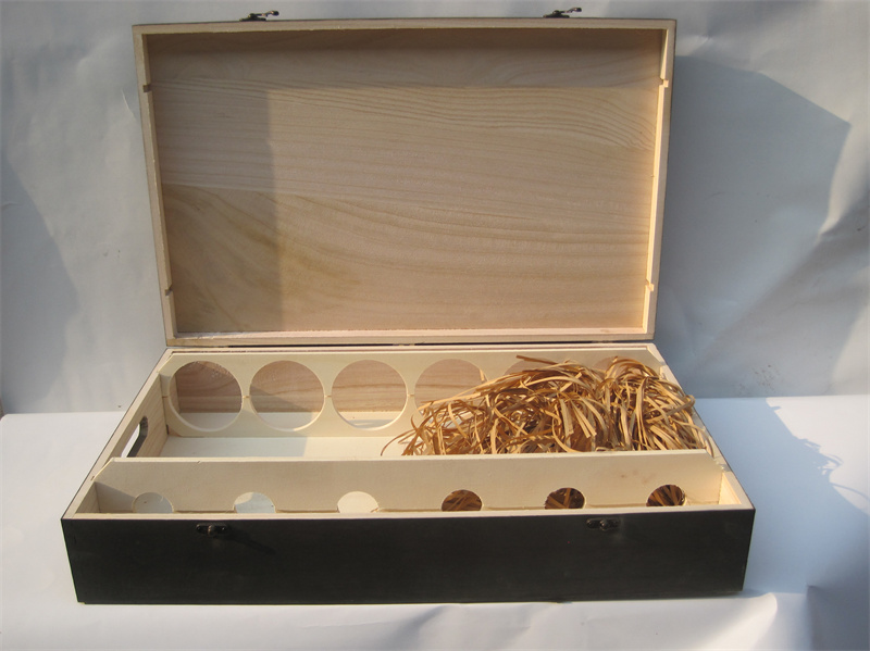 低價格的6瓶裝桐木紅酒包裝箱:材質為北方產的泡桐木,木質輕易加工,價格低,木箱外面常做碳化輕燒或重燒,也常做有色油漆。酒標圖案LOGO多是做鐳射激光雕刻。