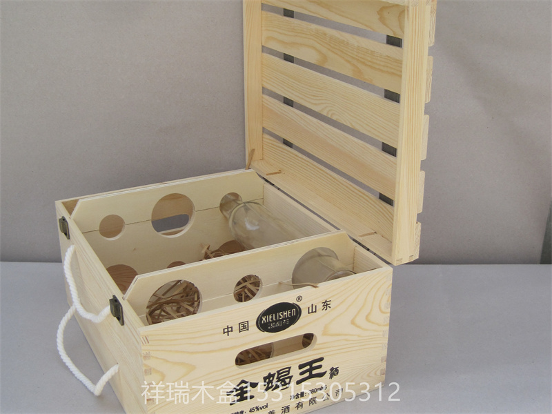 葡萄酒木箱子六支裝定制:材質松木實木,如何怎么打開方式是翻蓋,雙層六支裝,蓋子是實木條加裝皮革,印字多有絲印,烙印,熱壓等。