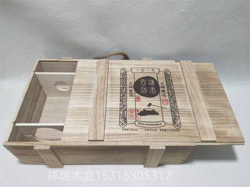 白酒四瓶包裝禮品木盒:原料為曹縣的泡桐木,燒色仿古做舊,平鋪一層放4瓶,蓋子為抽拉式。價(jià)格錢(qián)中等,木盒整體效果好。