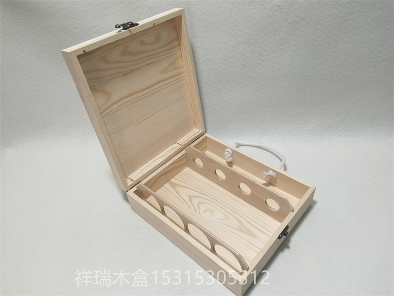 保健酒包裝木禮品盒:高檔保健酒木質包裝盒,木材是松木,酒瓶小瓶裝,設計好,四瓶裝,實木外做透明油漆,里面有內襯酒具,也可以不要。