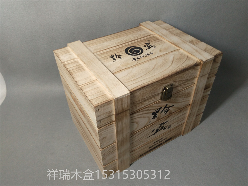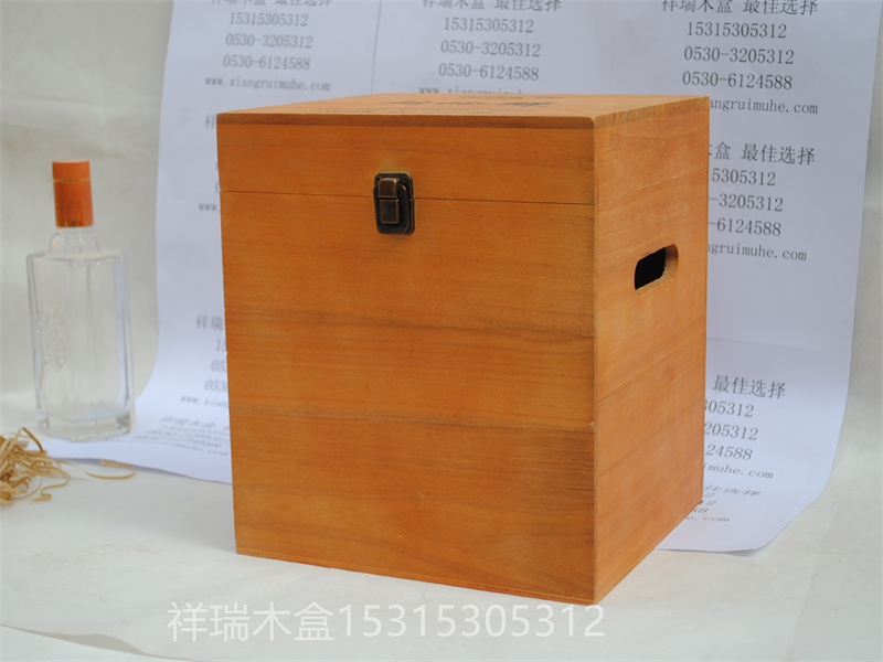 白酒六瓶包裝木箱子:外包裝木箱尺寸多是按酒瓶定制,木質多是梧桐木,松木,外加做油漆,內裝放6瓶白酒,常規尺寸比六瓶紙箱包裝少大一點。