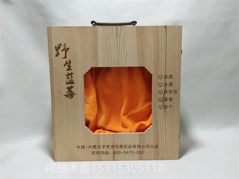 東北藍莓酒木禮盒:細高瓶,松木翻蓋,透明清漆,LOGO圖案印刷,內裝4瓶。