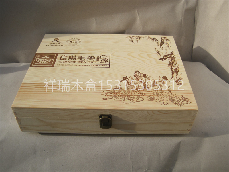 信陽毛尖茶禮品盒裝-經典老款-自然款,松木實木禮盒,自然環保,圖案自然清晰。